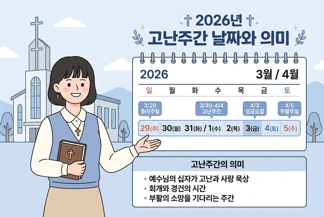 🚀 결론부터 말하면: 2026년 고난주간은 3월 29일 종려주일부터 4월 5일 부활절까지이며, 예수님의 마지막 7일간 행적을 요일별로 묵상하는 기간입니다.