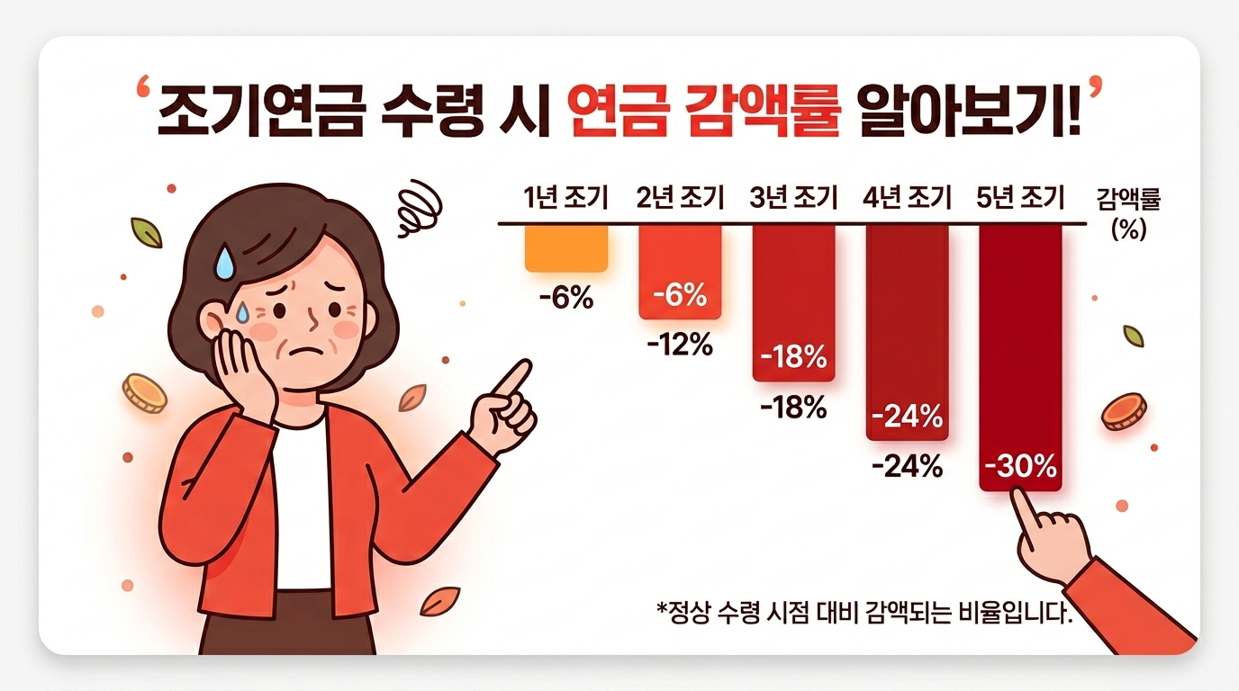 국민연금 조기수령은 정상 개시 연령보다 최대 5년 일찍 받을 수 있는 제도입니다. 다만, 1년 앞당길 때마다 연 6%(월 0.5%)씩 영구적으로 감액됩니다.