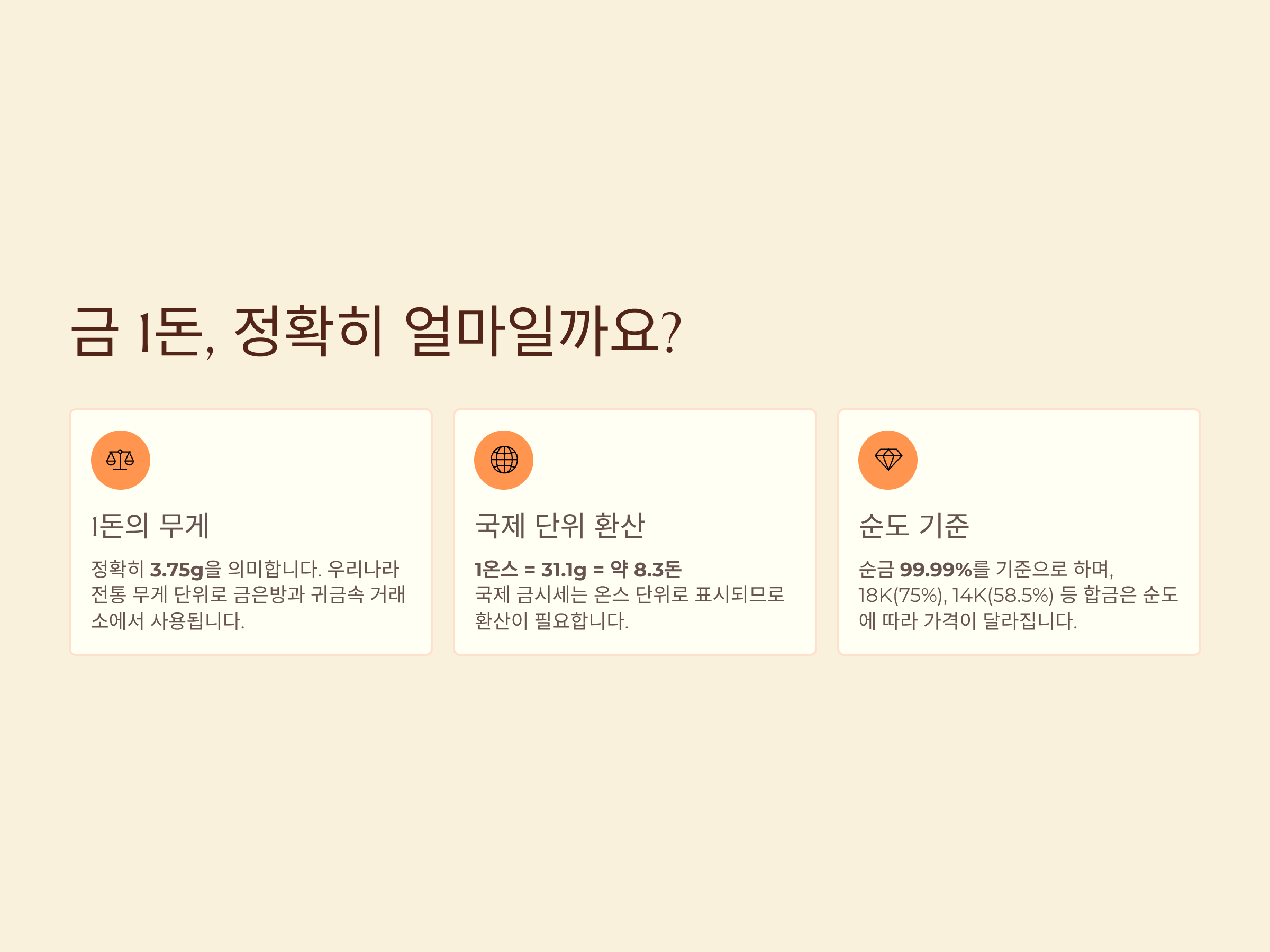 금 거래에서 사용되는 '1돈'은 정확히 3.75g을 의미합니다. 이는 우리나라 전통 무게 단위로, 주로 금은방이나 귀금속 거래소에서 사용됩니다. 국제 금시세는 온스(oz) 단위로 표시되는데, 1온스는 약 31.1g으로 8.3돈에 해당합니다.