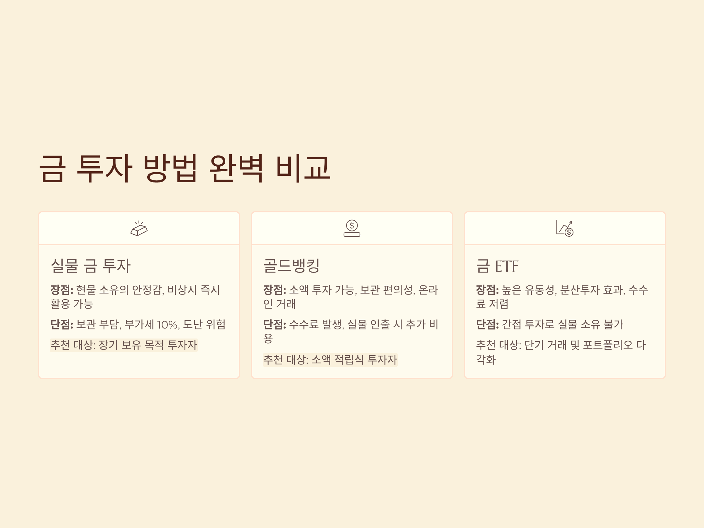 | 실물 금 | 안정성, 현물 보유 | 보관 부담, 부가세 |