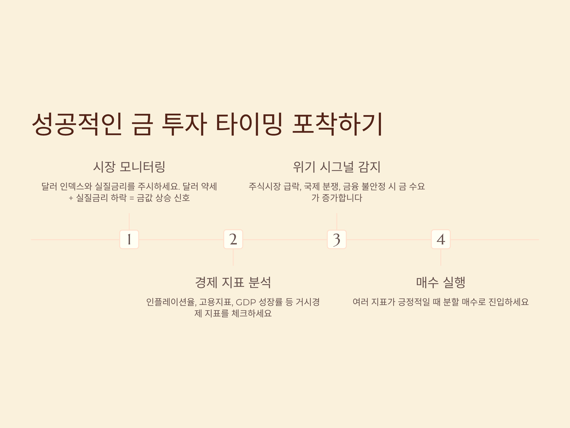 금 투자의 적절한 타이밍을 잡기 위해서는 달러 인덱스와 실질금리를 주시해야 합니다. 일반적으로 달러가 약세를 보이고 실질금리가 하락할 때 금값이 오르는 경향이 있습니다. 또한 주식시장이 불안정하거나 경제 불확실성이 높아질 때도 금 수요가 증가합니다.