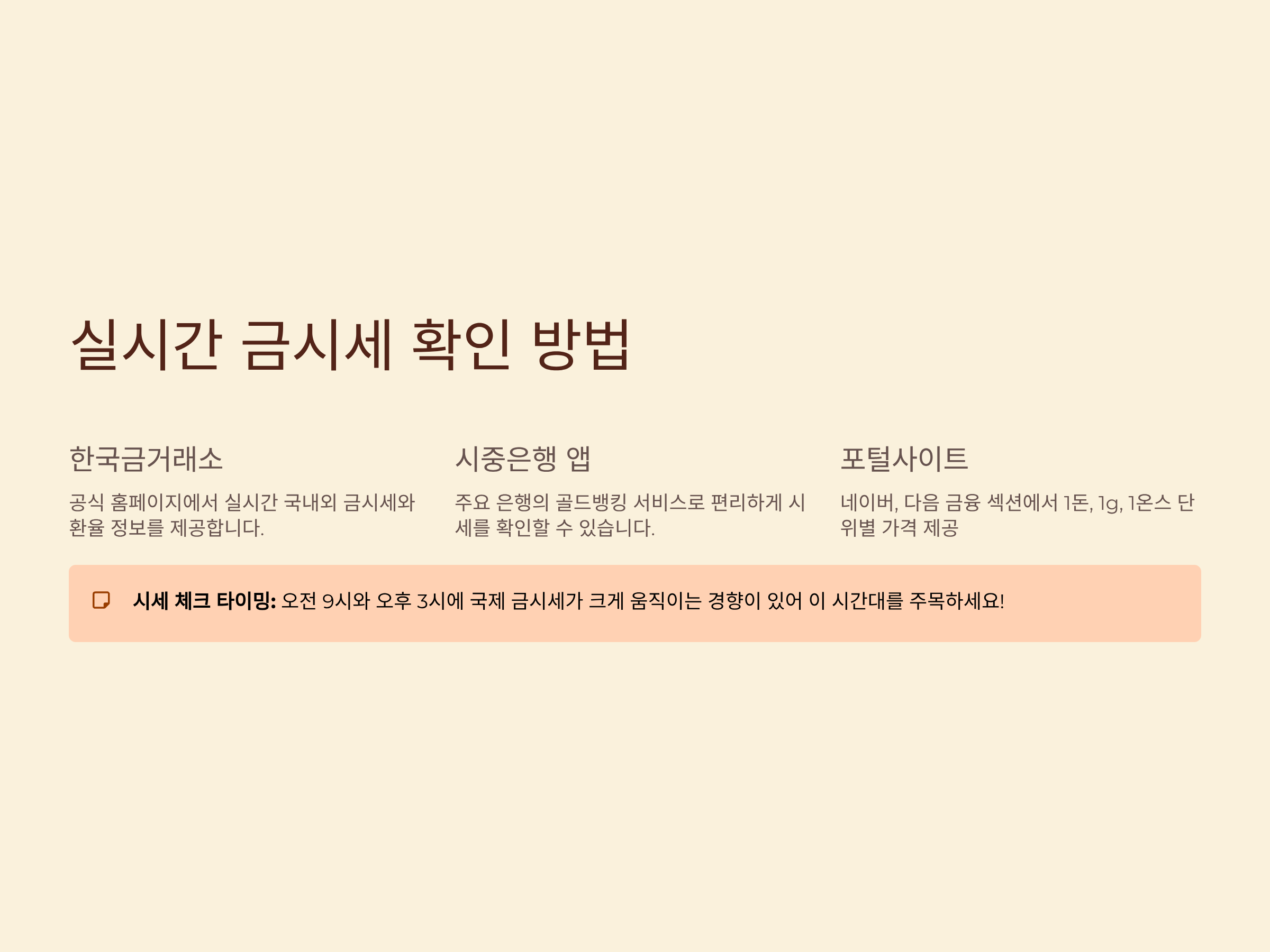 금값은 매일 변동하므로 실시간 시세 확인이 중요합니다. 특히 오전 9시와 오후 3시에 국제 금시세가 크게 움직이는 경향이 있어, 이 시간대를 주목할 필요가 있습니다.