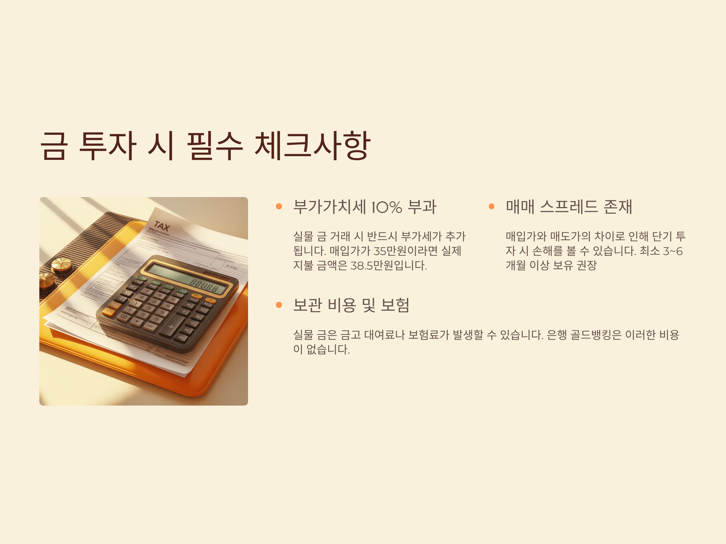 금 투자를 시작하기 전에 반드시 알아야 할 것이 있습니다. 첫째, 금 거래 시 부가가치세 10%가 부과됩니다. 둘째, 매매 스프레드(매입가와 매도가의 차이)가 존재해 단기 투자에는 불리할 수 있습니다. 셋째, 보관 비용과 도난 위험도 고려해야 합니다.