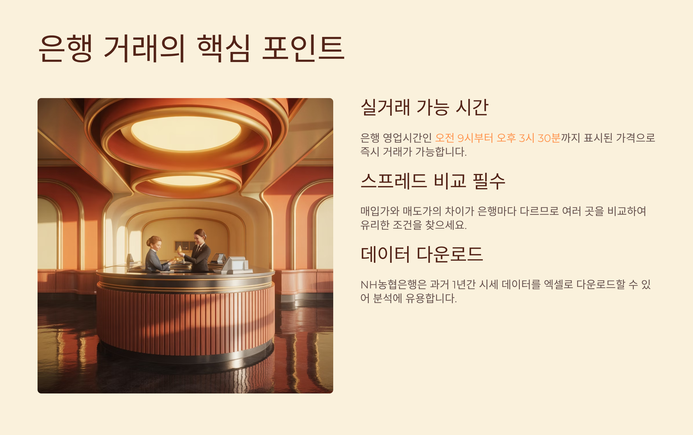 은행별로 제공하는 정보의 깊이도 달라요. NH농협은행은 과거 1년간의 시세 데이터를 엑셀로 다운로드할 수 있는 기능을 제공하고, 하나은행은 실시간 알림 서비스를 통해 목표 가격 도달 시 문자로 알려주는 서비스를 운영하고 있어요.