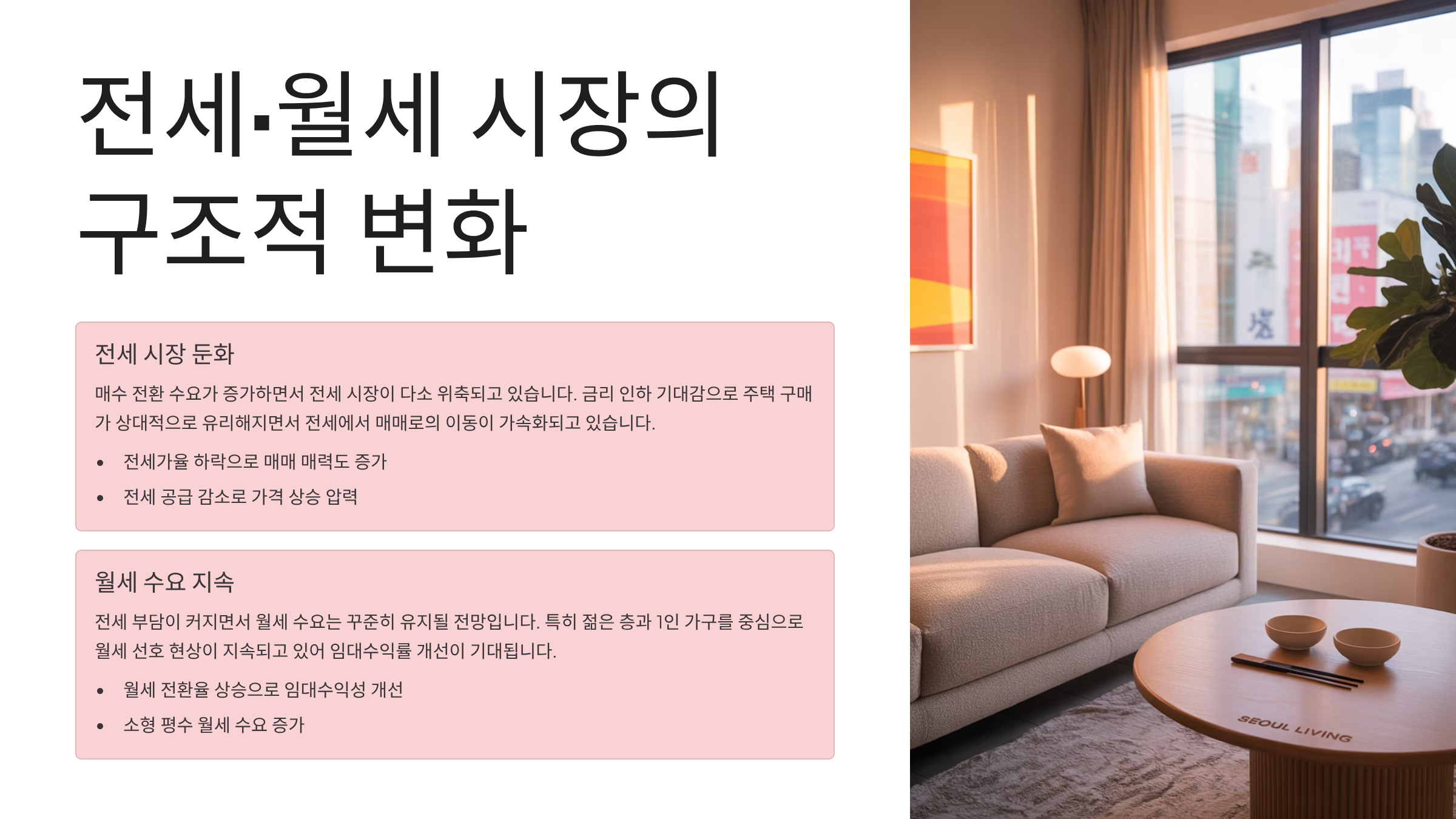 다만 월세 전환이 지속되던 추세 속에서, 금리 인하가 전세의 매력을 다시 키울 수 있다는 분석도 있어요. 집주인 입장에서는 낮은 금리와 전세 선호 증가가 맞물리면 다시 전세 물량을 확대할 가능성도 있어요.