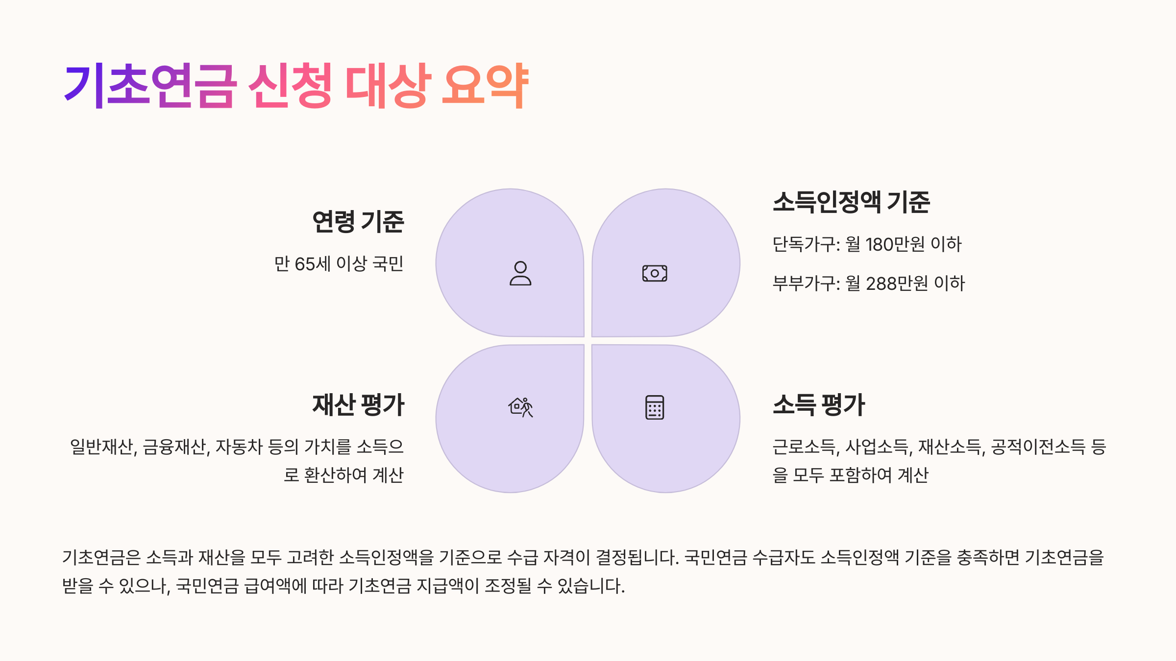 기초연금은 단순히 나이가 들었다고 자동으로 주어지는 건 아니에요. 만 65세 이상이면서, 일정한 소득과 재산 기준을 충족하는 사람만 신청할 수 있어요. 여기에 ‘소득인정액’이라는 기준이 핵심이에요.