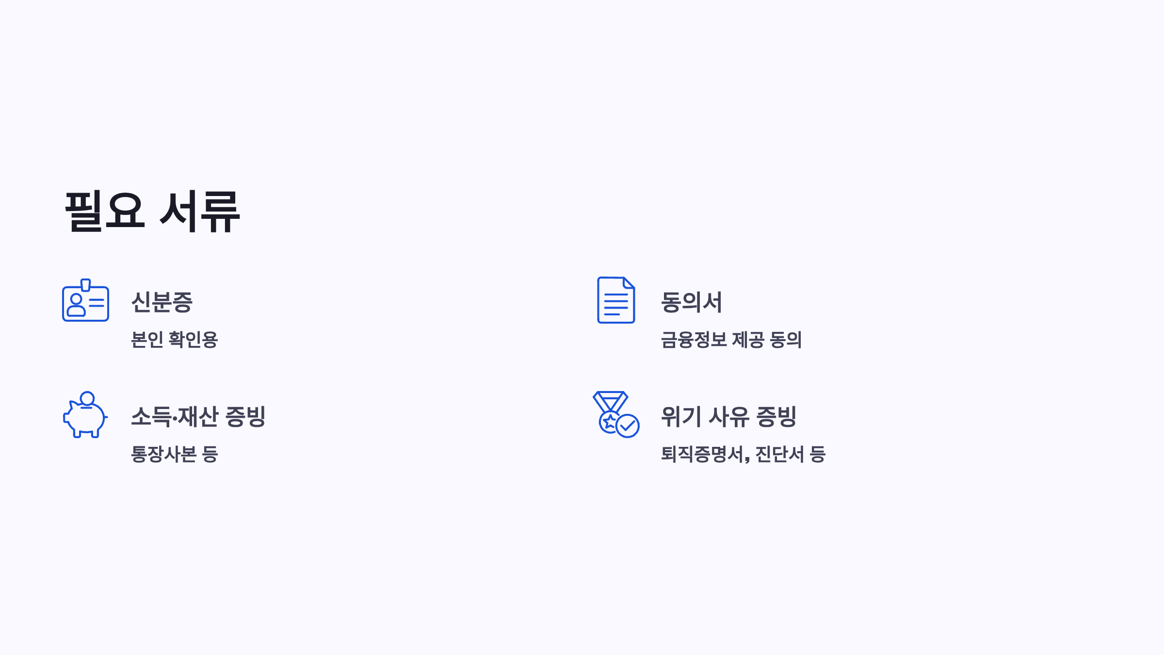 | 소득 상실 | 주 소득자 사망, 실직, 휴폐업, 사업장 화재 |
