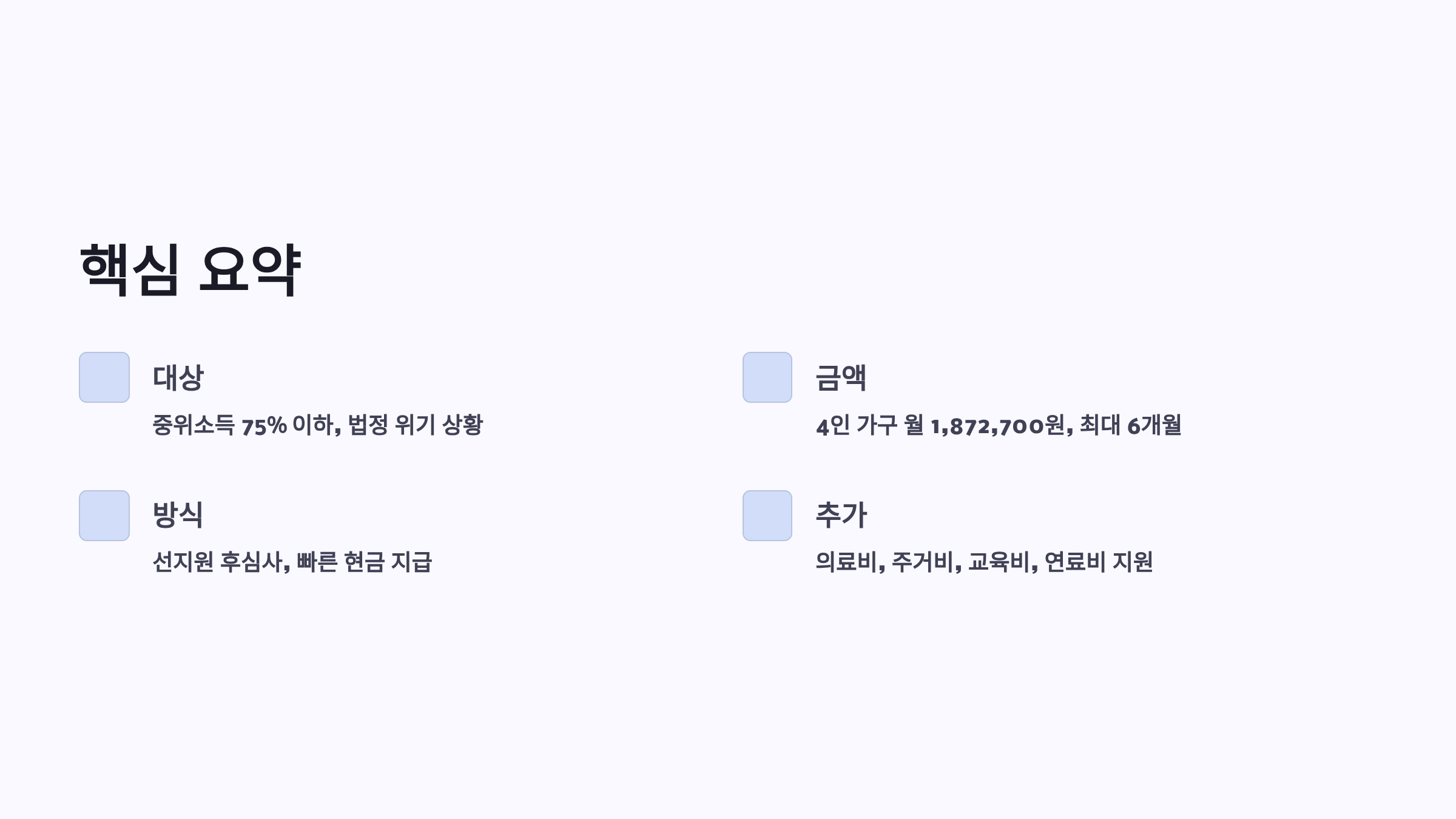 4인 가구 기준 월 1,872,700원까지 지원되며, 기본 1개월부터 최대 6개월까지 연속으로 받을 수 있습니다. 복잡한 서류 심사를 기다릴 필요 없이 긴급 상황을 우선 지원하므로, 당장 생활비가 필요한 가구에게 실질적인 도움이 됩니다.