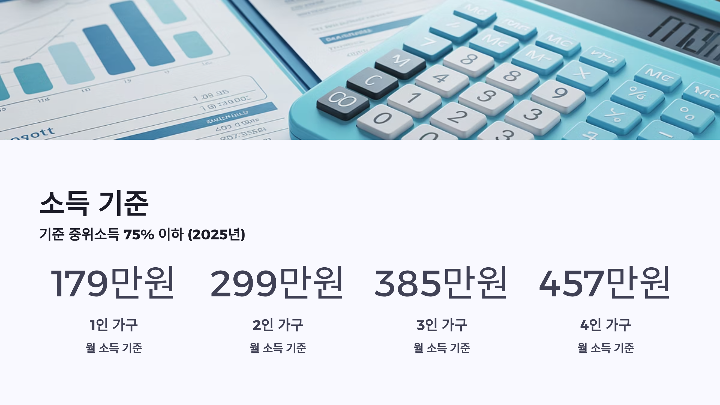 긴급생계비 지원을 받으려면 기준 중위소득 75% 이하의 소득 기준을 충족해야 합니다. 2025년 기준으로 1인 가구는 월 소득 1,794,010원 이하, 2인 가구는 2,991,980원 이하, 3인 가구는 3,848,980원 이하, 4인 가구는 4,573,330원 이하여야 합니다.