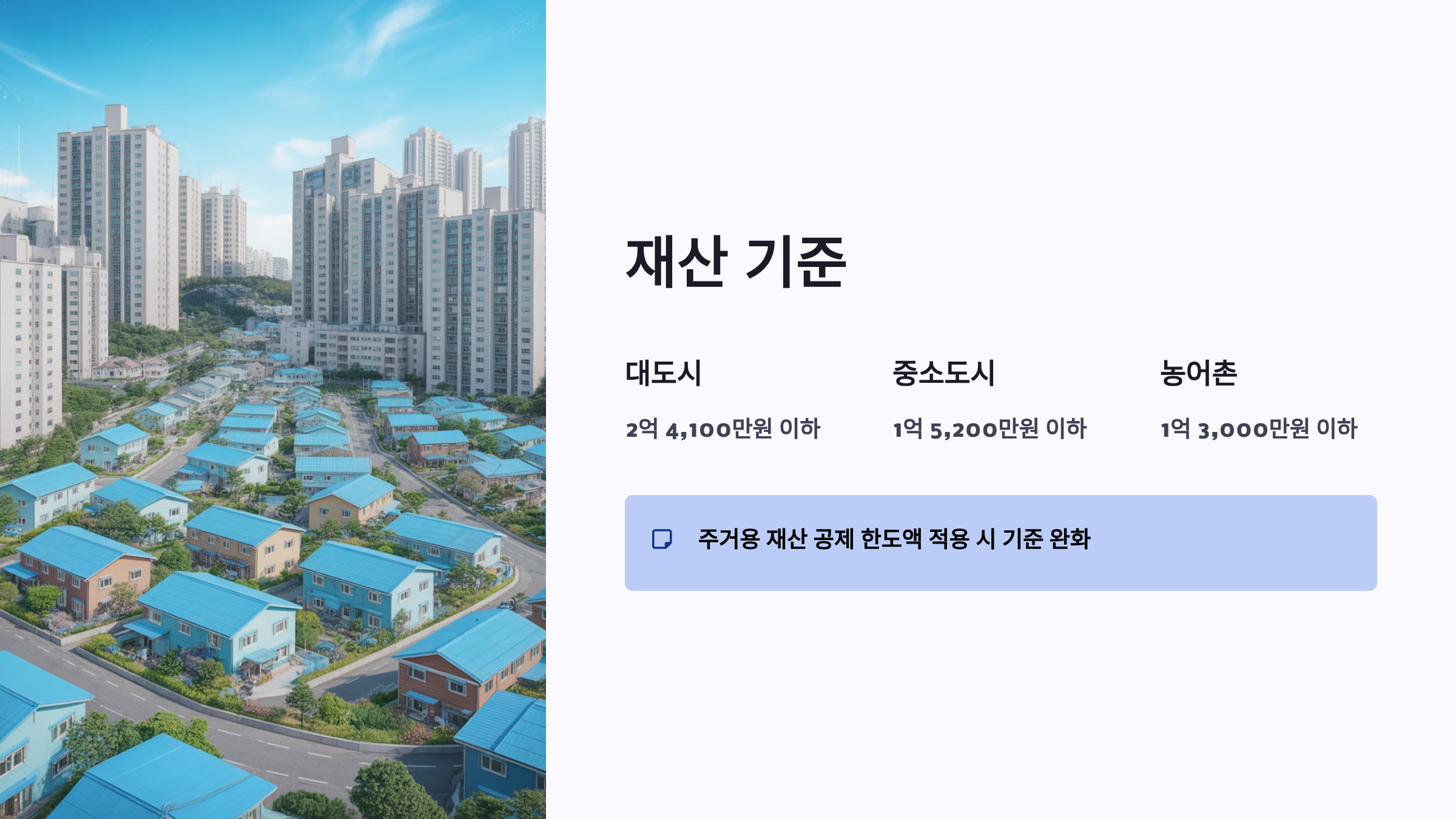 재산 기준은 거주 지역에 따라 다르게 적용되며, 대도시는 2억 4,100만원 이하, 중소도시는 1억 5,200만원 이하, 농어촌은 1억 3,000만원 이하입니다. 주거용 재산 공제 한도액을 적용하면 재산 기준이 완화되어 더 많은 가구가 혜택을 받을 수 있습니다. 금융재산은 1인 가구 기준 8,392,000원 이하이며, 주거 지원을 함께 받는 경우 200만원이 추가됩니다.