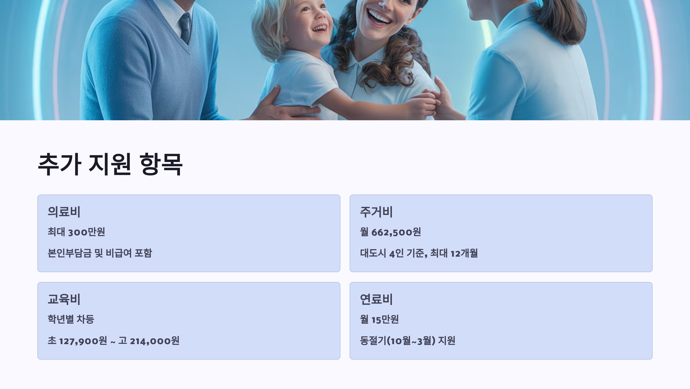 | 주거비 | 662,500원(4인) | 최대 12개월 |