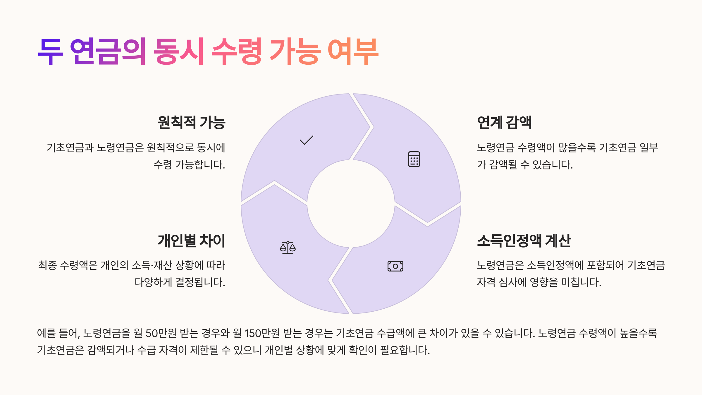 많은 분들이 궁금해하는 부분 중 하나가 바로 “기초연금과 노령연금을 함께 받을 수 있는지”에 대한 내용이에요. 결론부터 말하면, 두 연금은 동시에 받을 수 있어요. 다만 일정한 조건과 감액 규정이 존재해요.