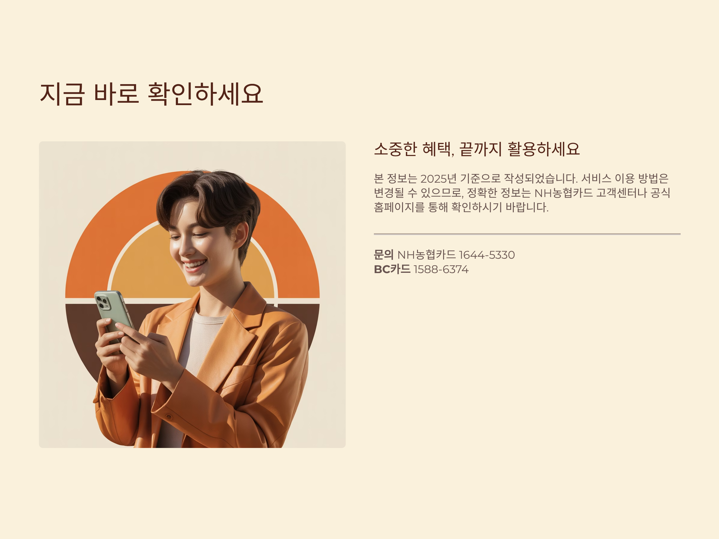 본 정보는 2025년 기준으로 작성되었으며, 서비스 이용 방법은 변경될 수 있습니다. 정확한 정보는 NH농협카드 고객센터나 공식 홈페이지를 통해 확인하시기 바랍니다.