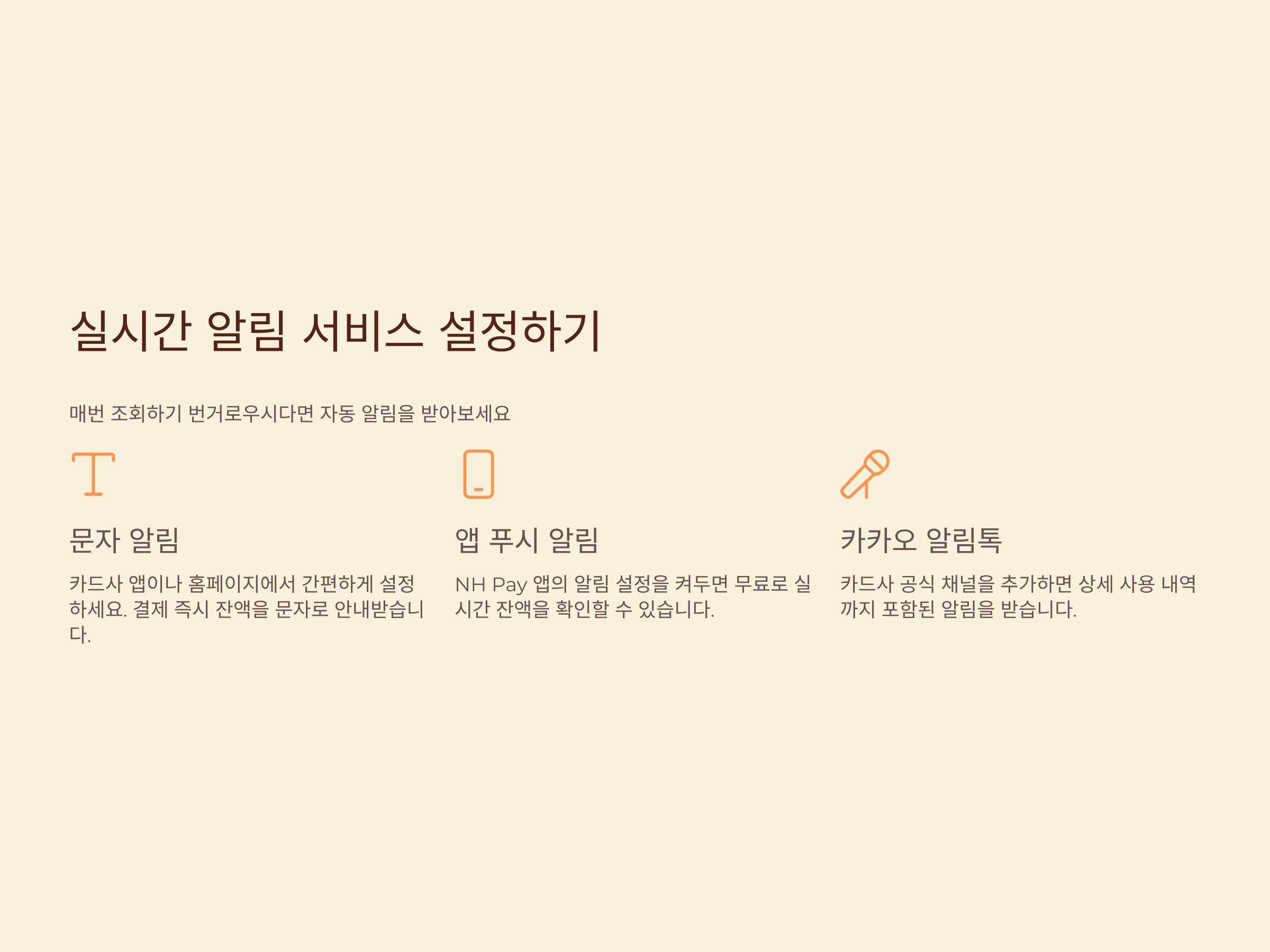 | 앱 푸시 알림 | NH Pay 앱 알림 설정 | 무료, 실시간 확인 |