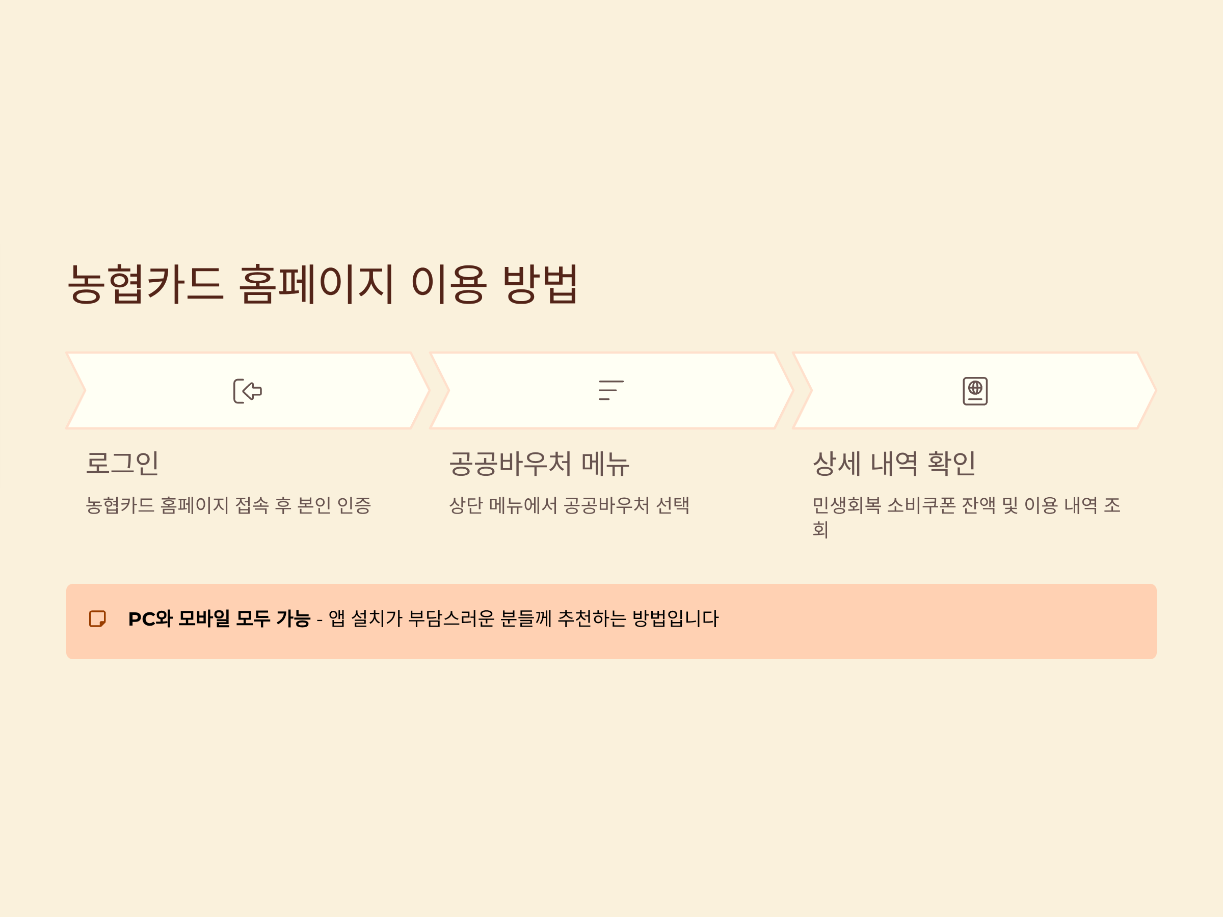 농협카드 홈페이지를 선호하신다면 로그인 후 공공바우처 메뉴로 이동하세요. 민생회복 소비쿠폰 항목에서 상세한 사용 내역과 잔액을 확인할 수 있습니다. PC나 모바일 웹브라우저 모두에서 접속 가능하여 앱 설치가 부담스러운 분들에게 적합합니다.