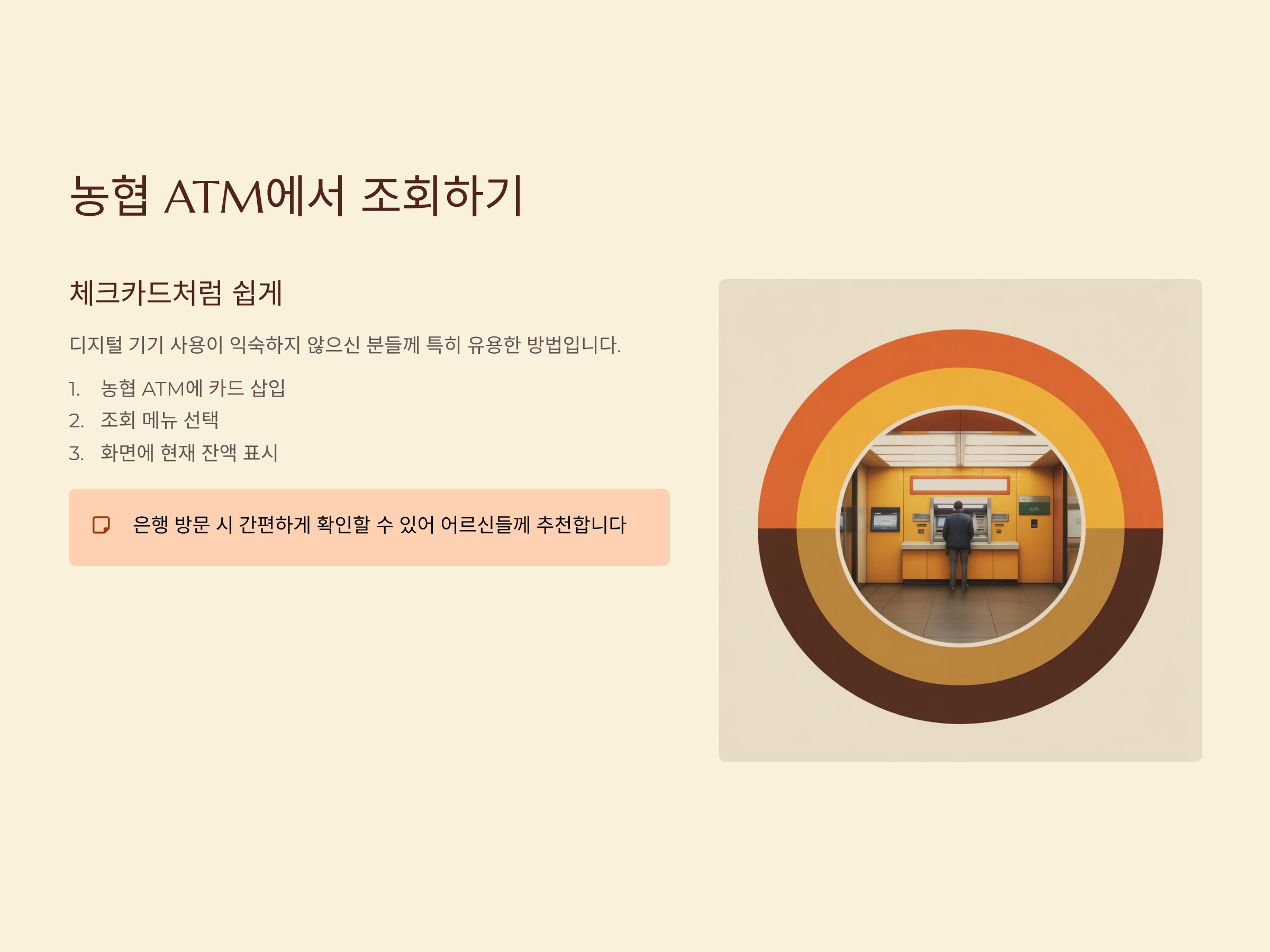 농협 ATM에서도 체크카드처럼 잔액 조회가 가능합니다. 카드를 삽입하고 조회 메뉴를 선택하면 현재 잔액이 화면에 표시됩니다. 은행 방문 시 간편하게 확인할 수 있어 디지털 기기 사용이 익숙하지 않은 어르신들에게 유용한 방법입니다.