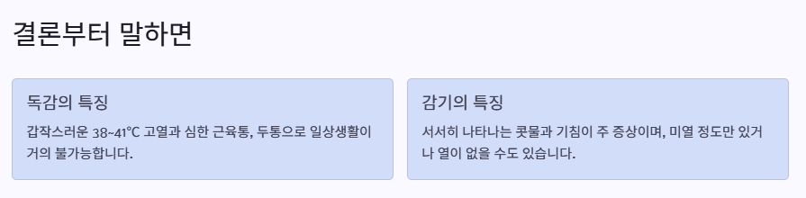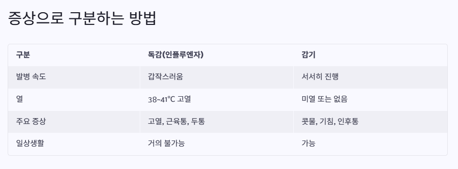 🚀 결론부터 말하면: 독감은 갑작스러운 고열과 심한 근육통이 특징이며, 감기는 미열과 콧물이 주증상입니다.