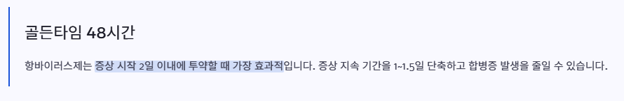 증상 후 48시간 이내가 골든타임입니다. 이 시간 내에 항바이러스제를 복용하면 증상의 지속 기간을 1~1.5일 단축하고 합병증 위험을 낮울 수 있습니다.