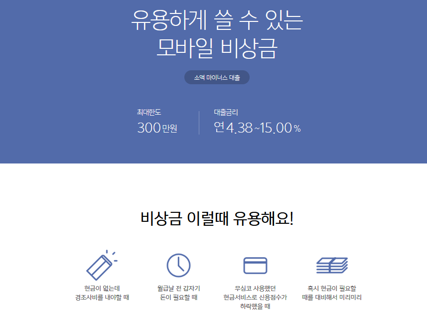 무엇보다 사용한 금액에 대해서만 이자가 부과되고, 한도를 쓰지 않으면 비용이 발생하지 않아요. 그래서 ‘있으면 든든한 비상금’이란 이름이 잘 어울려요.