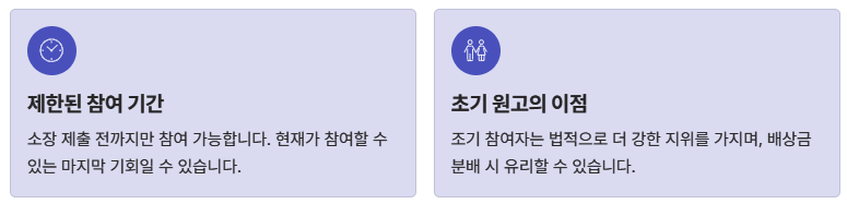 현재는 골든 타임입니다. 비용이 들지 않으므로 주저할 이유가 없으며, 이미 20만 명 이상이 참여하고 있습니다. 소장 제출 전에 초기 원고로 등재되면 법적으로 더 유리하기 때문에, 지금 바로 참여하는 것이 최선의 선택입니다.