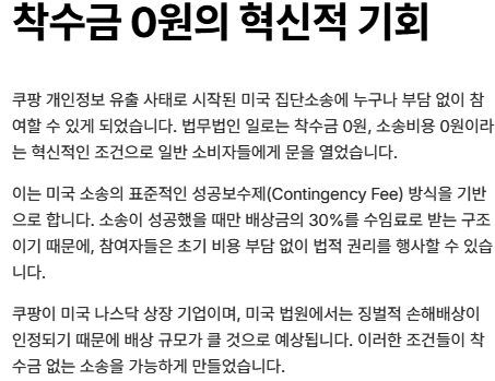 🚀 결론부터 말하면: 법무법인 일로는 쿠팡 미국 집단소송을 착수금 0원, 소송비용 0원으로 진행하고 있으며, 성공 시에만 수임료 30%를 받는 방식으로 운영됩니다.