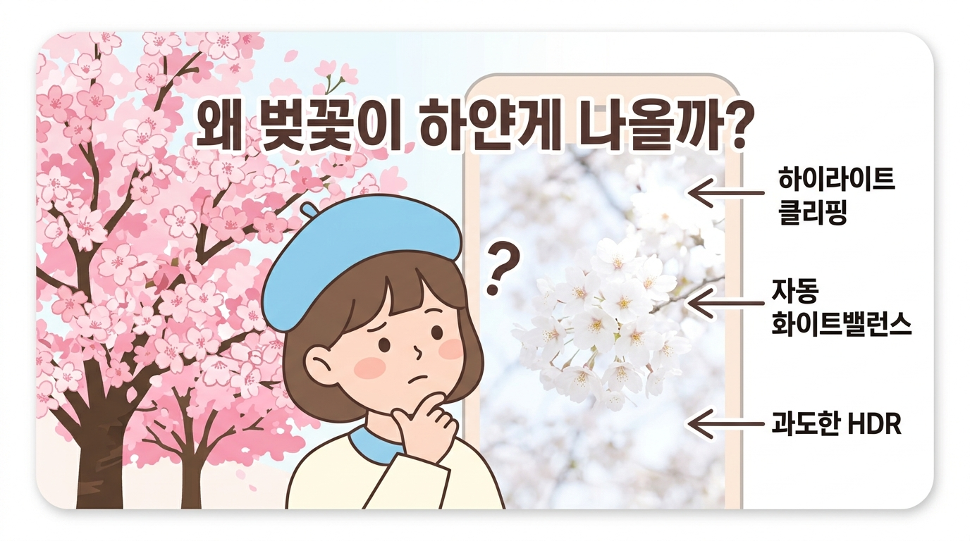 카메라 센서는 밝은 피사체를 촬영할 때 자동으로 노출을 줄이는 경향이 있어요. 벚꽃은 대부분 흰색에 가까운 연분홍이라, 카메라가 이 밝기를 기준으로 전체 노출을 낮춰버리면서 꽃잎의 미묘한 핑크 톤이 날아가게 돼요. 여기에 자동 화이트밸런스까지 작동하면 꽃잎의 색감이 더 빠져 보이게 되죠.