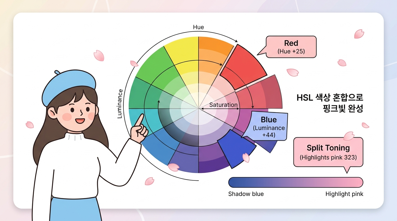 기본 보정만으로도 괜찮지만, HSL(색상 혼합)과 색상 등급(Split Toning)까지 건드려야 진짜 벚꽃다운 분홍빛이 완성돼요. 이 부분이 아마 가장 중요한 단계일 거예요.