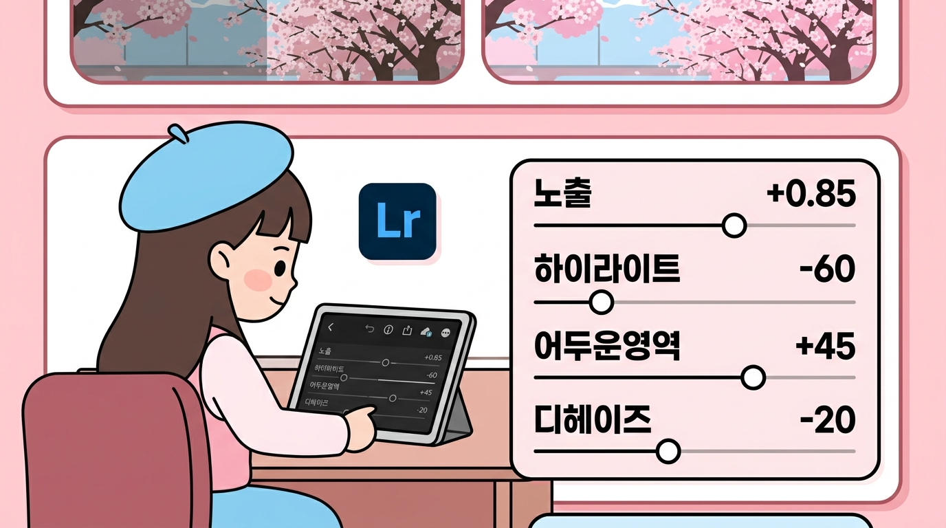 이번에 알려드린 설정값은 범용적으로 잘 먹히는 수치이지만, 촬영 환경(날씨, 시간대, 조명)에 따라 미세 조정은 필요해요. 값을 그대로 넣은 뒤 자기 사진에 맞게 ±10~20 범위에서 조금씩 움직여 보면 나만의 벚꽃 프리셋이 완성될 거예요. 라이트룸에서는 이 설정을 '사전 설정(Preset)'으로 저장해 두면 다음 사진에도 원클릭으로 적용할 수 있으니 꼭 활용해 보세요.