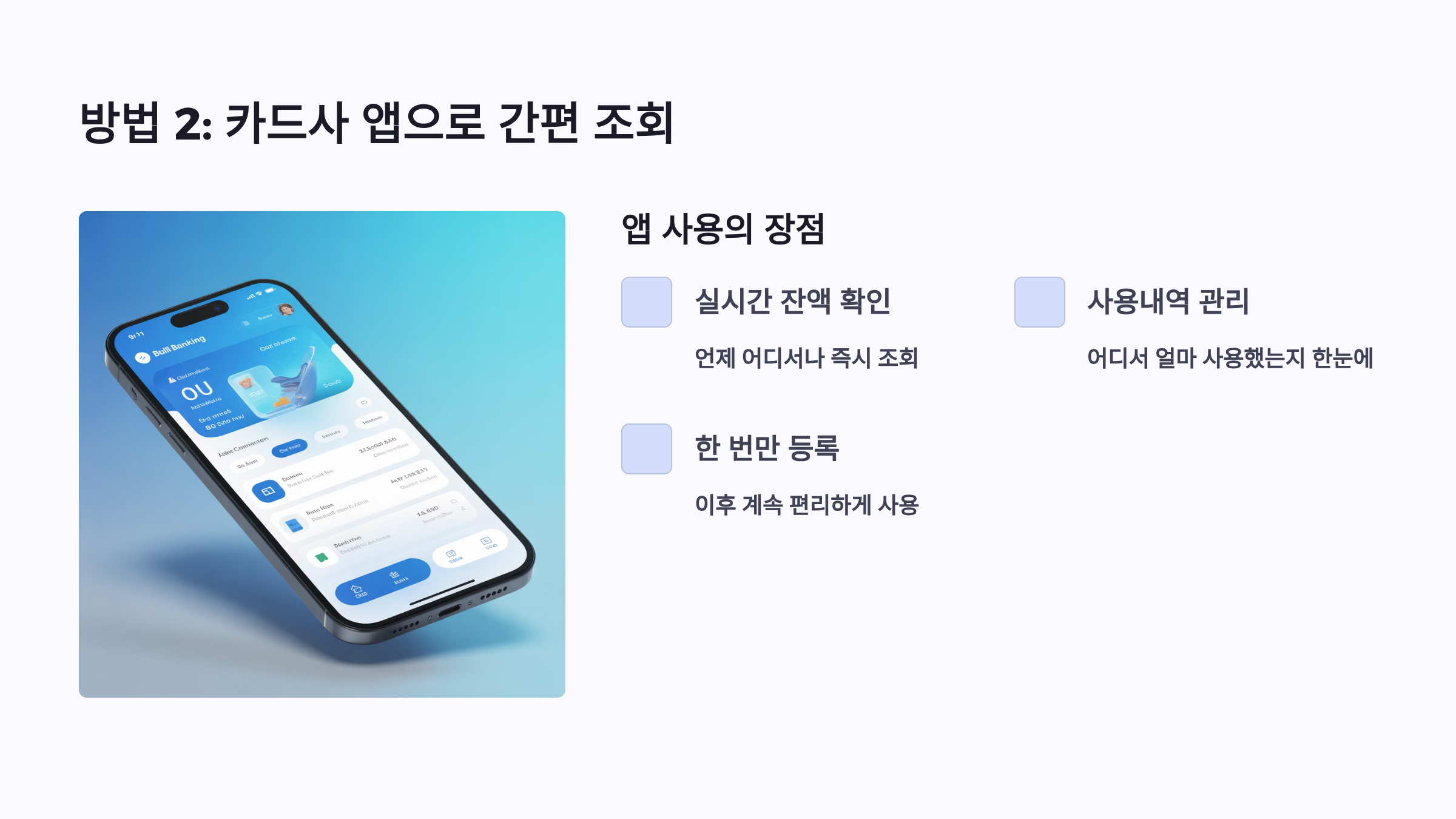 앱을 다운받고 카드 번호를 등록하는 과정이 필요하지만, 한 번만 설정하면 실시간으로 잔액을 확인할 수 있어 편리합니다. 카드사 홈페이지에서도 동일한 서비스를 이용할 수 있습니다.