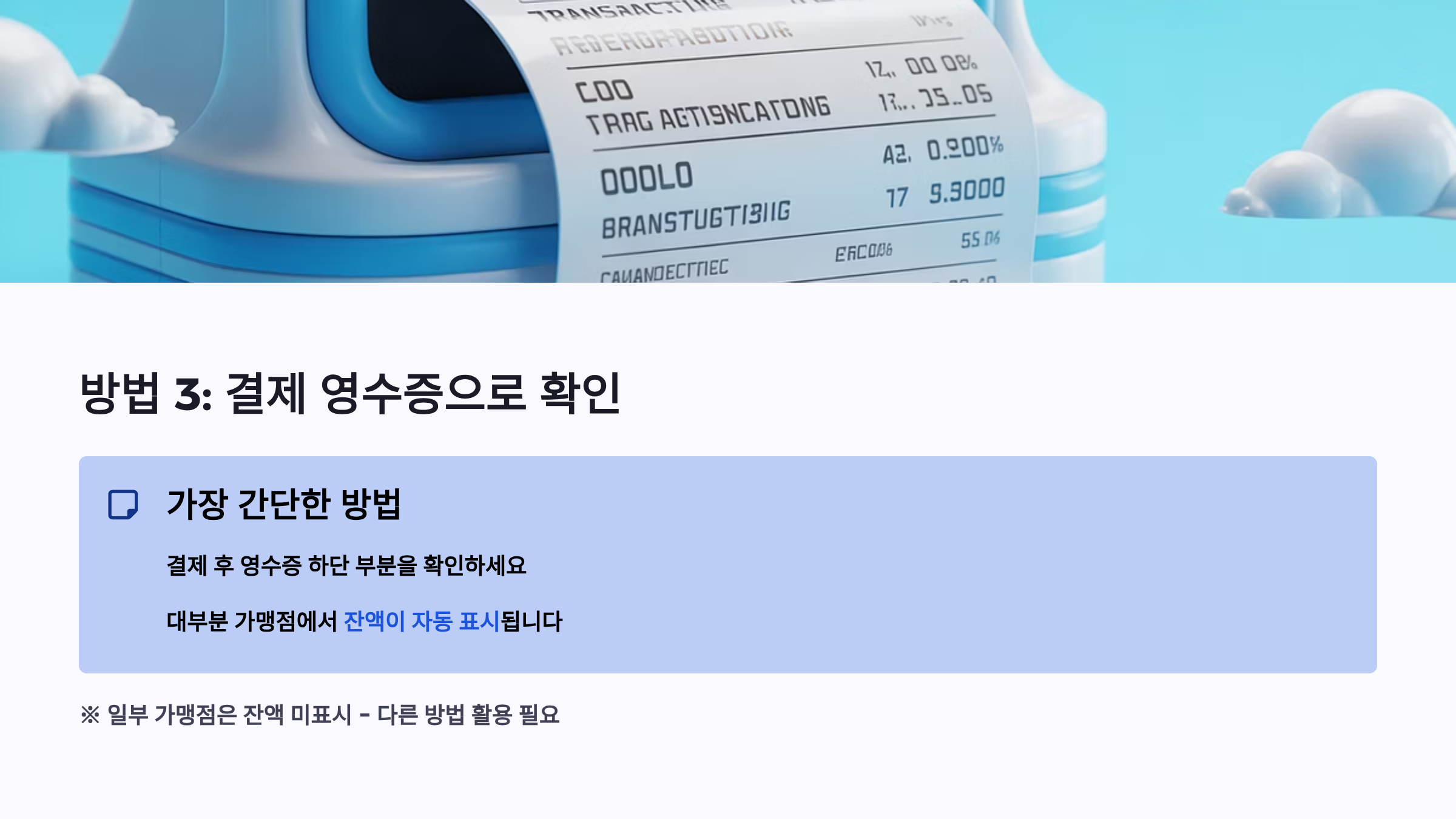 영수증을 받은 후 하단 부분을 꼼꼼히 확인하면 현재 잔액을 바로 알 수 있습니다. 다만 일부 가맹점에서는 잔액이 표시되지 않을 수 있으니, 이 경우 다른 방법을 활용하세요.