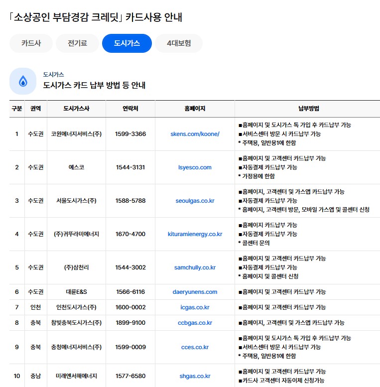 도시가스 요금도 부담경감 크레딧으로 결제할 수 있어요. 서울도시가스를 비롯한 예스코, 대륜E&S, 코원에너지 등 대부분의 지역 도시가스사가 신용·체크카드 결제를 지원하고 있어요.