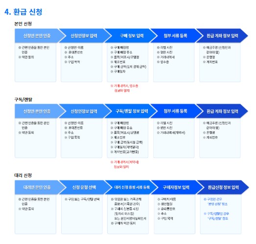 먼저 본인 인증을 거친 뒤 신청 정보를 입력하고, 구매 또는 계약 관련 정보를 등록해야 해요. 그다음에는 구매 증빙 서류를 업로드하고 환급받을 계좌를 입력하면 완료돼요.