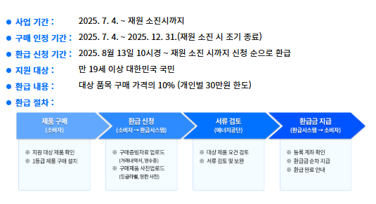 2025년 으뜸효율 환급사업은 7월 4일부터 본격적으로 시작됐어요. 다만 예산이 한정되어 있기 때문에, 지원금이 모두 소진되면 조기 종료될 수 있어요. 늦게 신청하면 혜택을 못 받을 수도 있답니다!