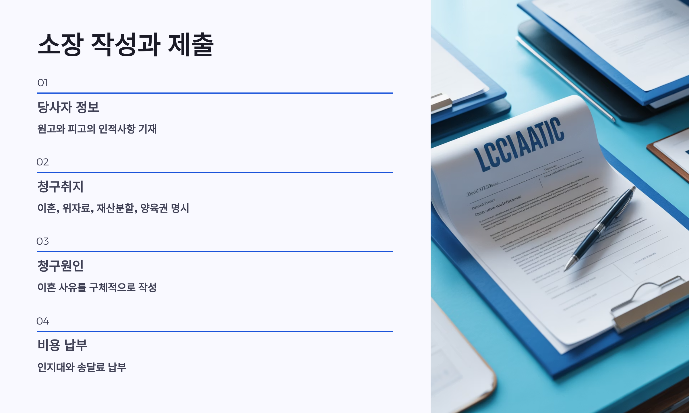 조정이 불성립되면 가정법원에 이혼 소장을 제출해야 합니다. 소장에는 당사자 정보, 청구취지, 청구원인을 명확히 기재해야 합니다. 청구취지에는 "원고와 피고는 이혼한다"는 내용과 함께 위자료, 재산분할, 양육권 지정 등을 병합하여 청구할 수 있습니다.