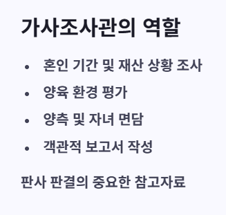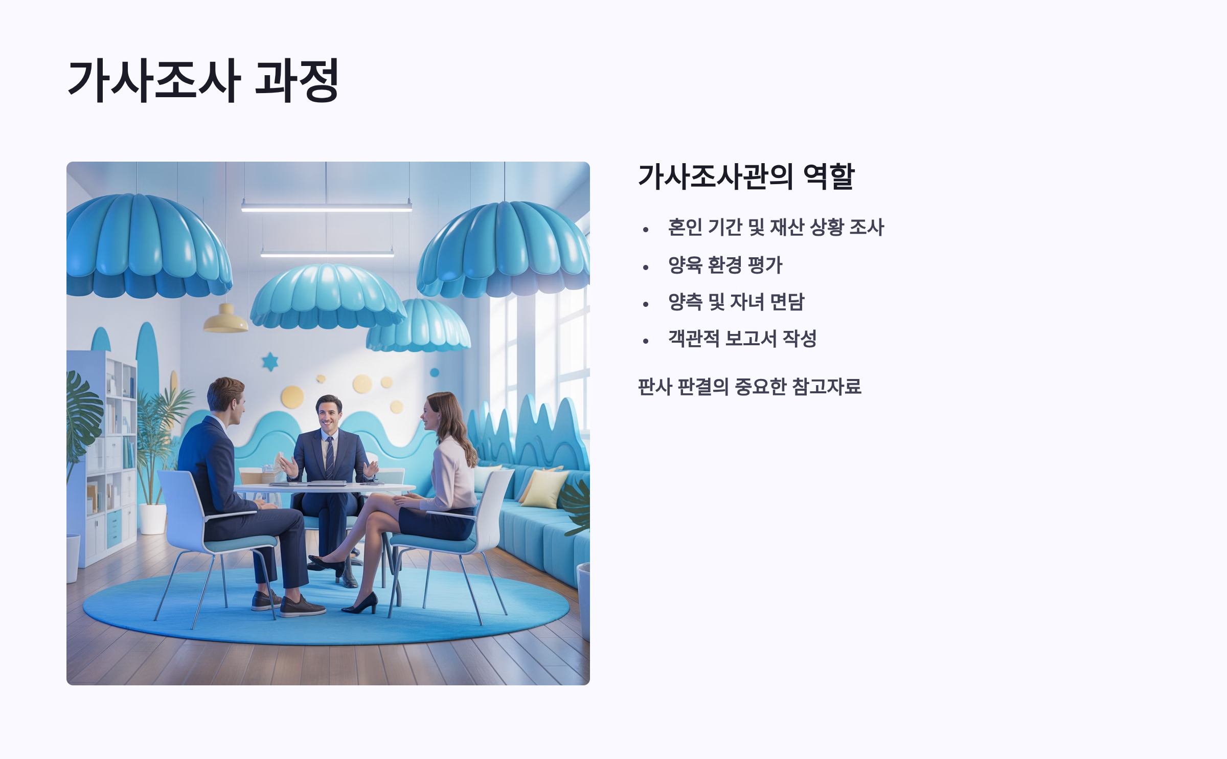 소송이 시작되면 법원은 가사조사관을 통해 혼인 기간, 재산 상황, 양육 환경 등을 조사합니다. 조사관은 양측을 면담하고 필요시 자녀와도 면담하여 객관적인 보고서를 작성합니다. 이 보고서는 판사가 판결을 내리는 데 중요한 참고자료가 되므로 성실하게 협조해야 합니다.