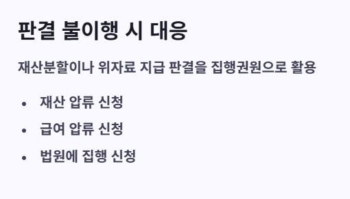 이혼 신고가 완료되면 호적에 이혼 사실이 기재되고 법적으로 이혼이 완료됩니다. 재산분할이나 위자료 지급이 판결에 포함되어 있다면 집행권원으로 활용하여 강제집행을 신청할 수 있습니다. 상대방이 판결 내용을 이행하지 않을 경우 법원에 집행 신청을 하면 재산을 압류하거나 급여를 압류할 수 있습니다.