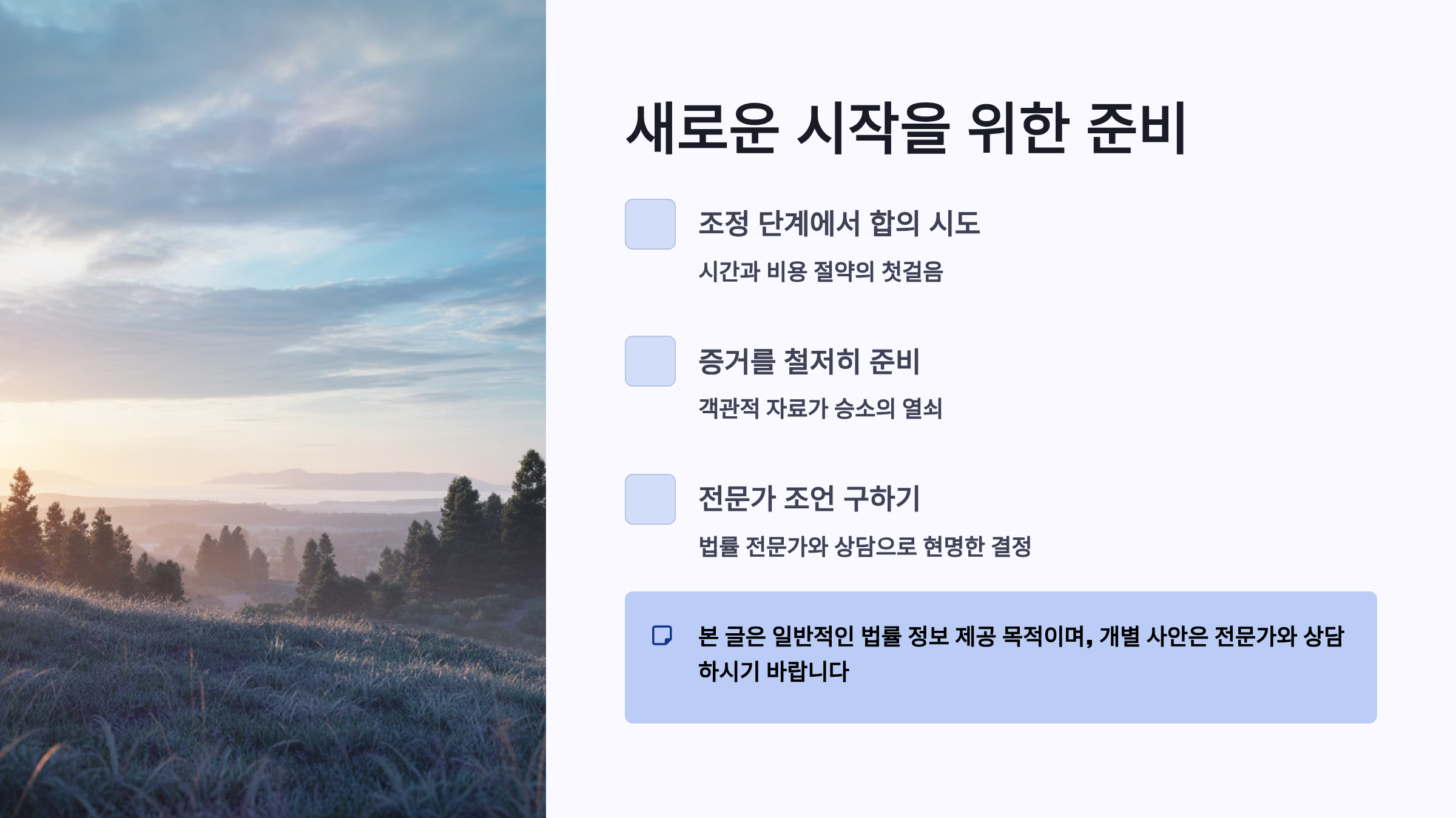 이혼소송은 조정 신청부터 판결 확정까지 여러 단계를 거치지만, 각 절차의 목적과 준비사항을 이해하면 충분히 대응할 수 있습니다. 조정 단계에서 합의를 시도하고, 소송이 불가피하다면 증거를 철저히 준비하세요.