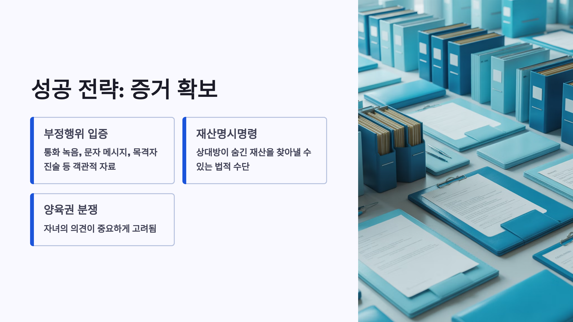 이혼소송에서 유리한 결과를 얻으려면 충분한 증거 확보가 가장 중요합니다. 배우자의 부정행위를 입증하려면 통화 녹음, 문자 메시지, 목격자 진술 등 객관적인 자료가 필요합니다. 재산분할에서는 재산명시명령을 신청하여 상대방이 숨긴 재산을 찾아낼 수 있습니다.