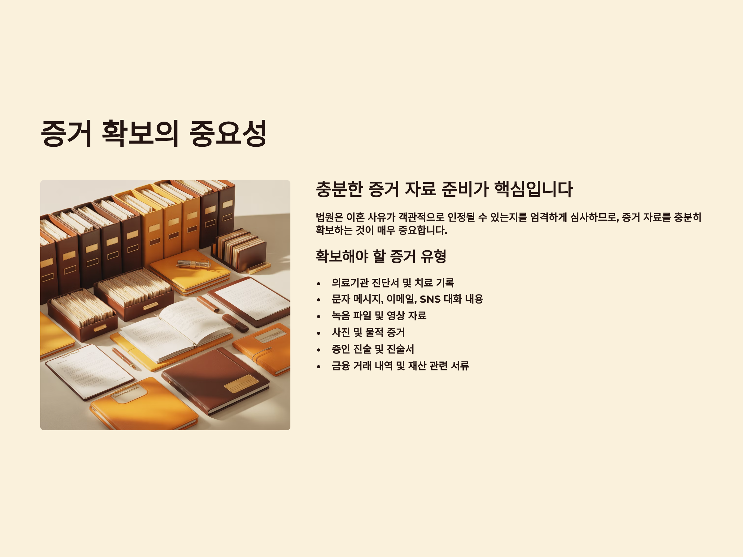 특히 혼인을 계속하기 어려운 중대한 사유는 포괄적인 개념으로, 배우자의 지속적인 가정폭력, 알코올 중독, 도박 중독, 경제적 무능력 등 다양한 상황이 포함될 수 있습니다. 다만 법원은 이러한 사유가 객관적으로 인정될 수 있는지를 엄격하게 심사하므로, 증거 자료를 충분히 확보하는 것이 매우 중요합니다. 진단서, 문자 메시지, 녹음 파일, 사진, 증인 진술 등 다양한 형태의 증거를 체계적으로 준비해야 합니다.