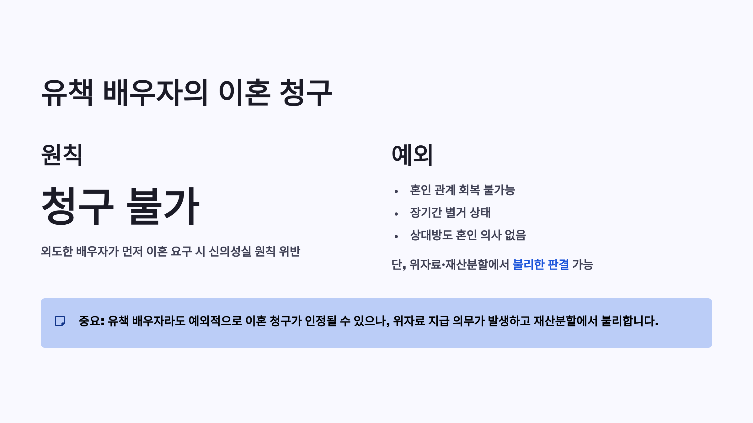 | 유책 배우자 이혼 청구 | 청구 불가 | 혼인 관계 회복 불가능, 장기 별거 |