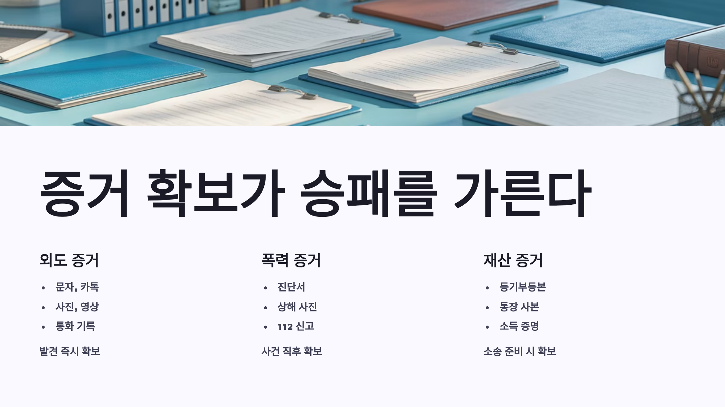 | 폭력 증거 | 진단서, 상해사진, 112신고 | 사건 발생 직후 |
