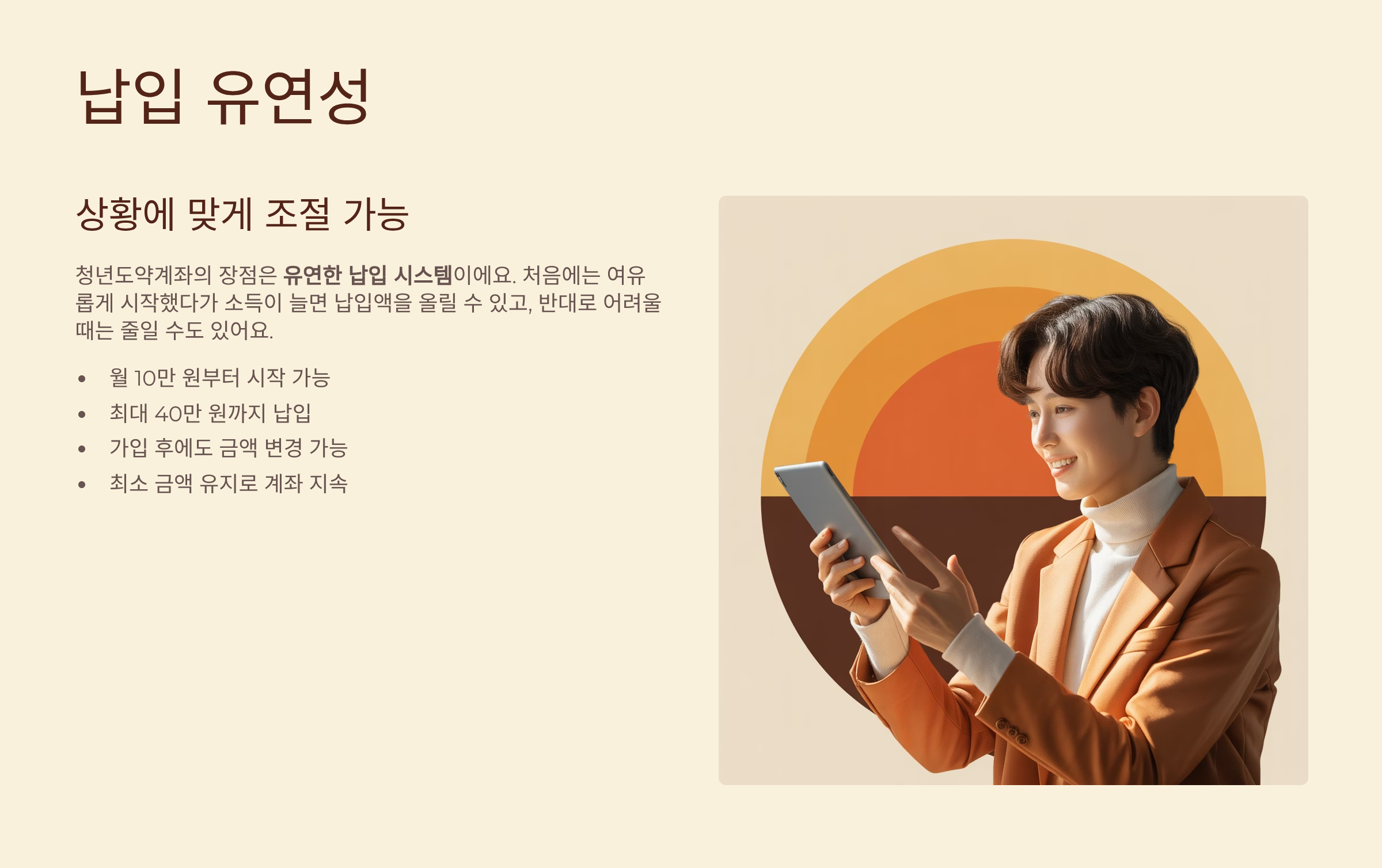 납입 금액은 월 10만 원에서 40만 원 사이에서 자유롭게 설정할 수 있고, 가입 후에도 변경이 가능해요. 처음에는 적은 금액으로 시작했다가 소득이 늘어나면 납입액을 늘릴 수 있죠. 반대로 경제 상황이 어려워지면 납입액을 줄일 수도 있어요. 이런 유연성 덕분에 장기 저축이 부담스러운 청년들도 도전해볼 만해요.