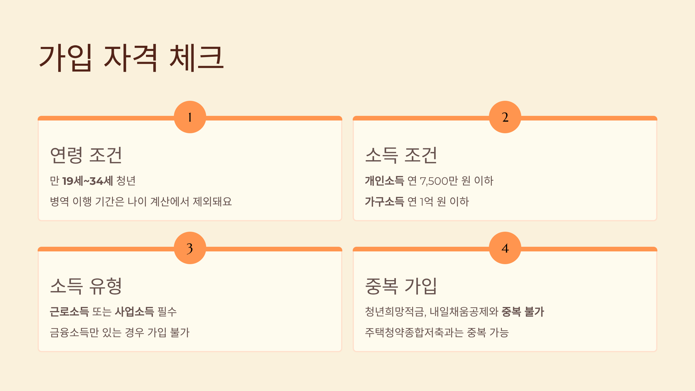청년도약계좌에 가입하려면 먼저 나이 조건을 충족해야 해요. 만 19세부터 34세까지의 청년이 가입 대상이고, 병역 이행 기간은 나이 계산에서 제외돼요. 예를 들어 2년간 군 복무를 했다면 만 36세까지 가입이 가능한 거죠. 이는 병역 의무를 이행한 청년들에게 불이익이 없도록 배려한 제도예요.