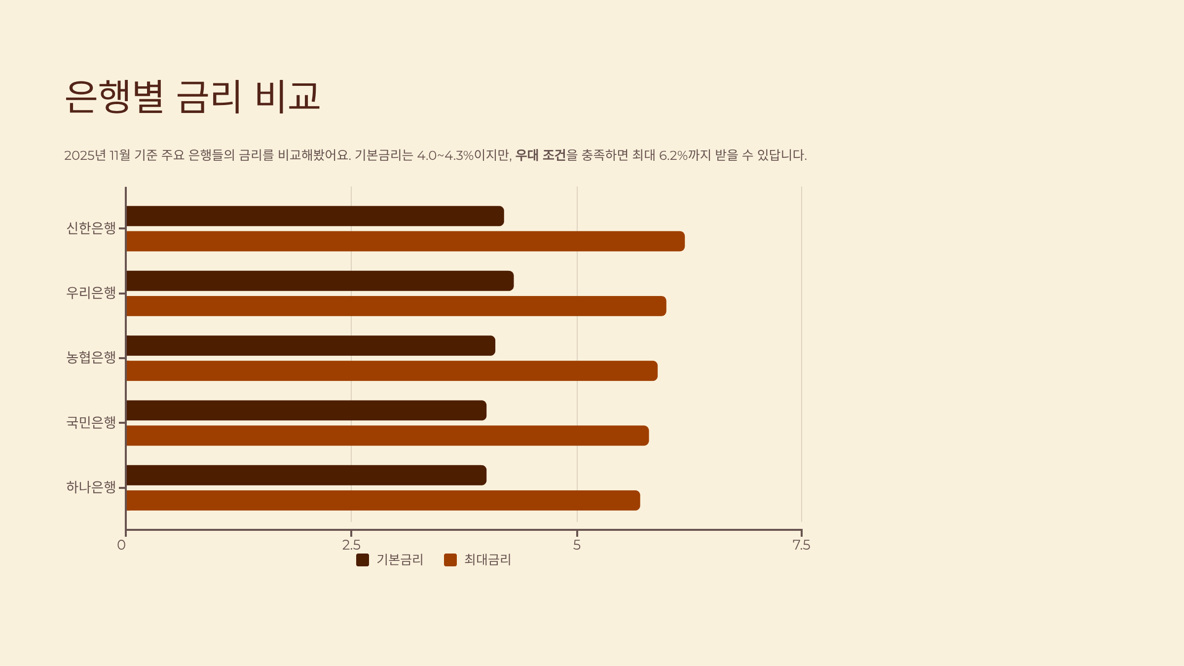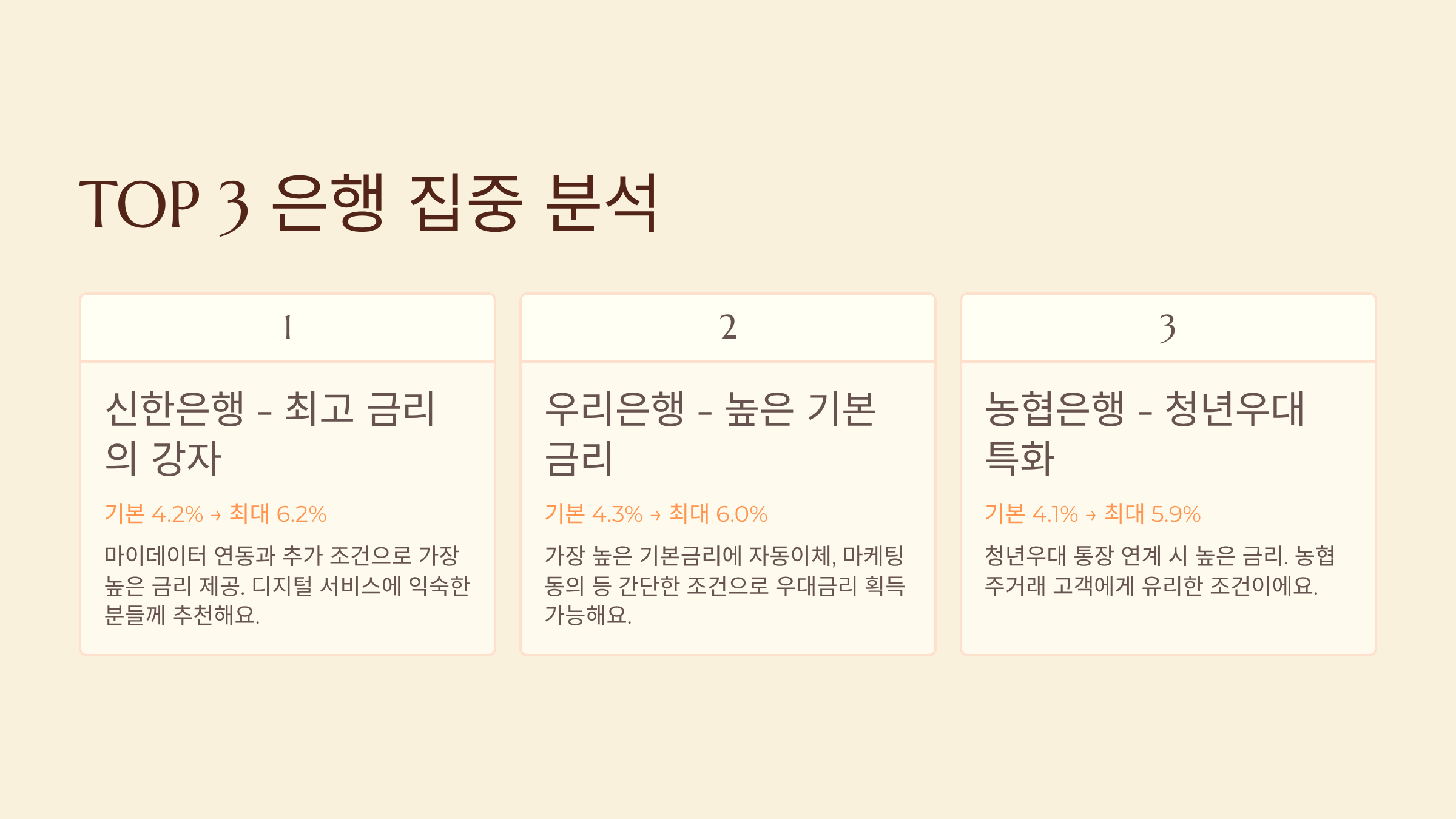농협은행은 청년우대 통장과 연계하면 최대 5.9%까지 금리를 받을 수 있고, 국민은행은 급여이체를 포함한 우대 조건으로 최대 5.8%를 제공해요. 하나은행은 간편앱으로 신청이 가능하다는 장점이 있지만, 최대 우대금리는 5.7%로 다른 은행보다 약간 낮은 편이에요.