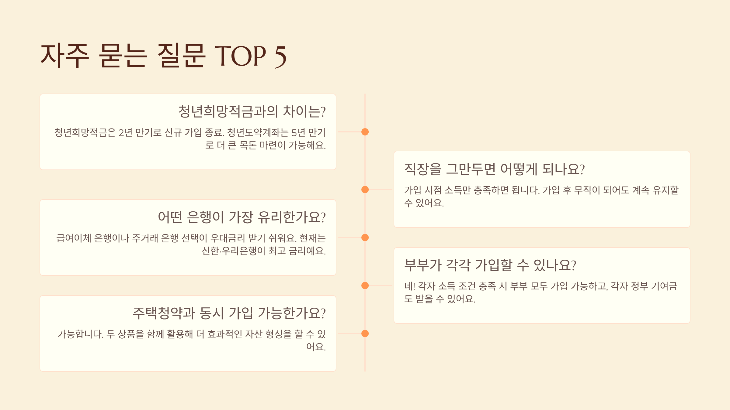 기존에 청년희망적금이나 내일채움공제 같은 다른 정책금융 상품을 보유하고 있다면 중복 가입이 불가능해요. 하지만 청년희망적금이 만기되었거나 해지한 경우에는 청년도약계좌에 가입할 수 있어요. 또한 주택청약종합저축이나 일반 적금과는 중복 가입이 가능하니 이 점도 참고하세요.