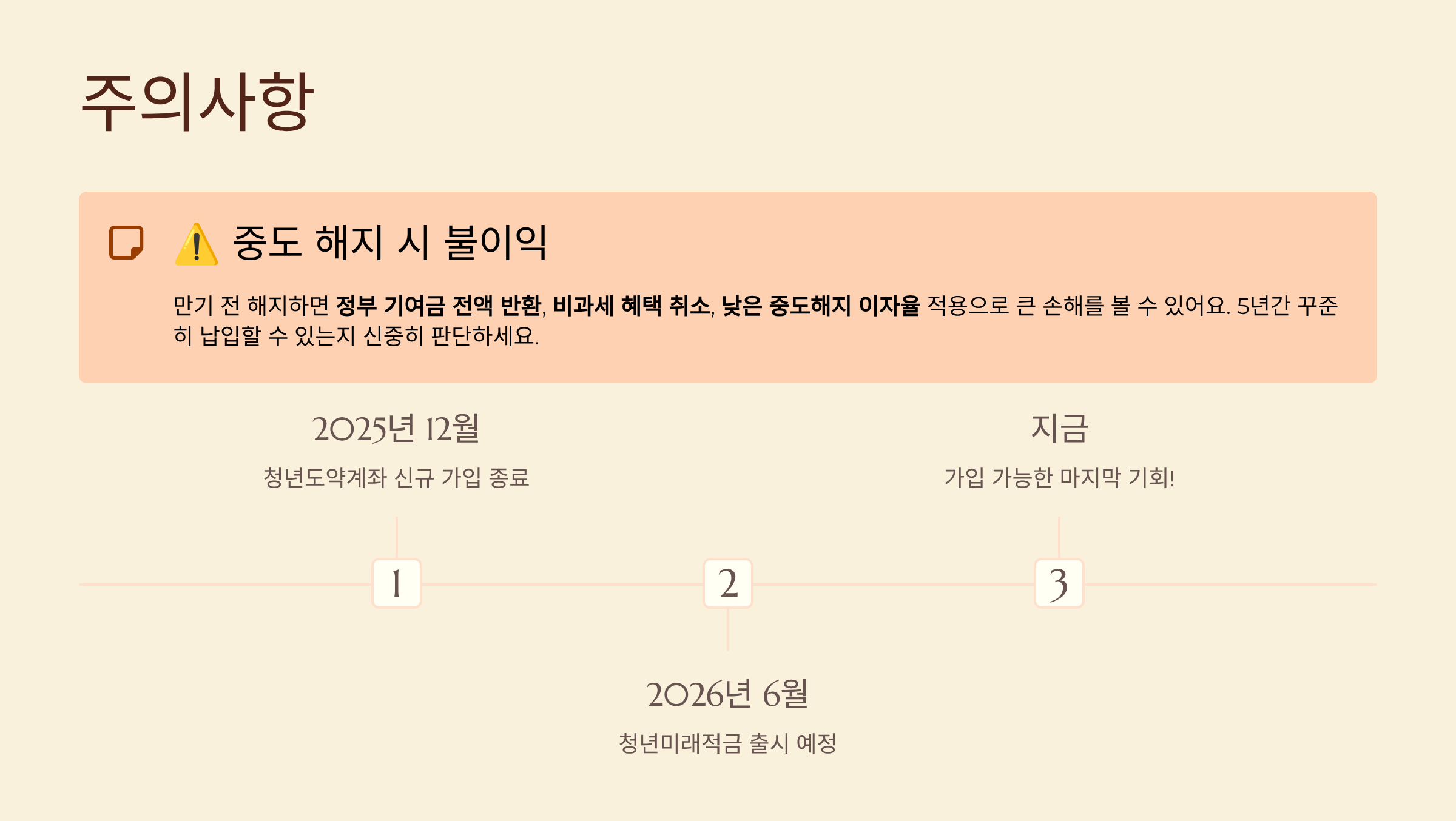 청년도약계좌를 가입할 때 가장 주의해야 할 점은 중도 해지 시 불이익이에요. 만기 전에 해지하면 그동안 받았던 정부 기여금을 모두 반환해야 하고, 비과세 혜택도 취소돼요. 또한 약정 이자율이 아닌 중도해지 이자율이 적용되어 일반 예금 수준의 낮은 이자만 받게 되죠. 따라서 5년간 꾸준히 납입할 수 있는지 신중히 판단해야 해요.