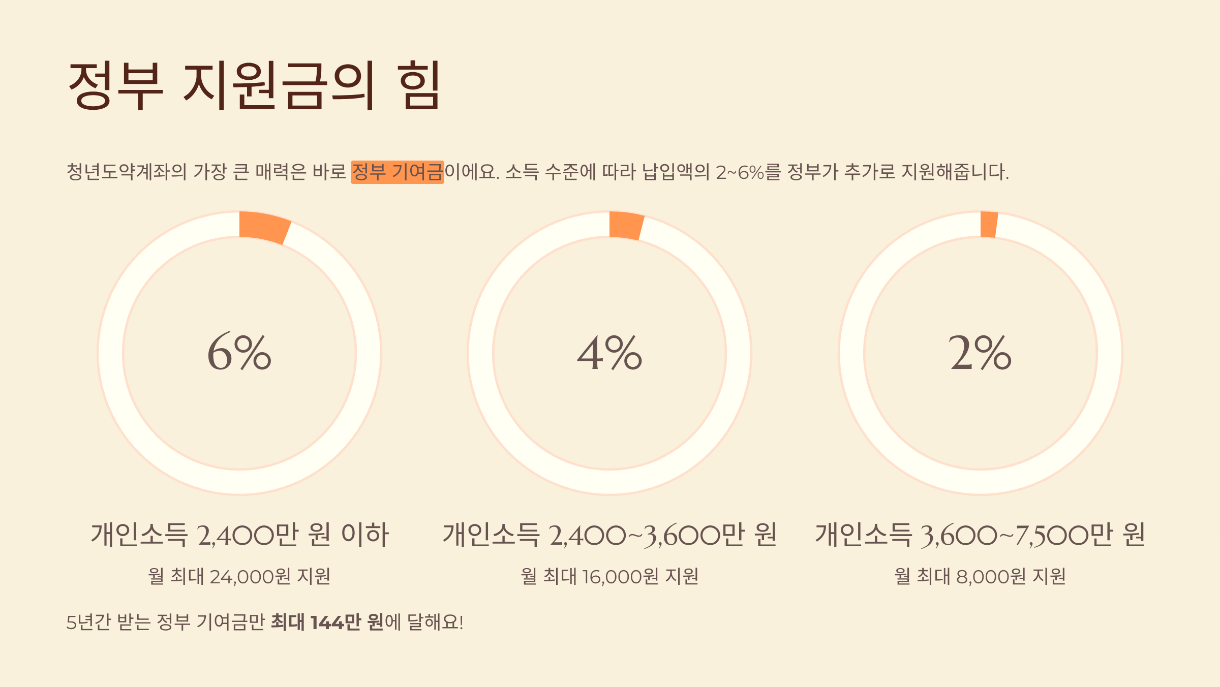 청년도약계좌의 가장 큰 매력은 바로 정부 기여금이에요. 가입자의 개인소득이 2,400만 원 이하인 경우 납입액의 6%를 매월 지원받을 수 있고, 소득이 높아질수록 지원 비율은 줄어들지만 그래도 상당한 금액을 지원받을 수 있어요. 월 40만 원을 납입하는 경우 최대 월 2만 4천 원의 정부 기여금을 받을 수 있죠.
