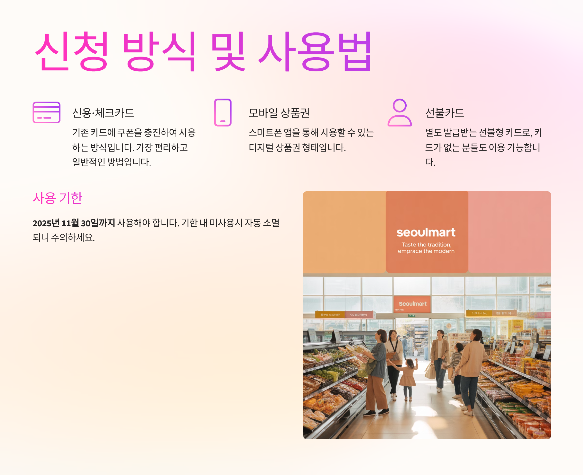 신청 시 별도의 서류는 필요 없고, 신분증만 있으면 된다는 점도 편리하죠. 지급 수단에 따라 사용 가능한 가맹점도 달라질 수 있기 때문에 사용 전에 미리 확인하는 게 좋아요.