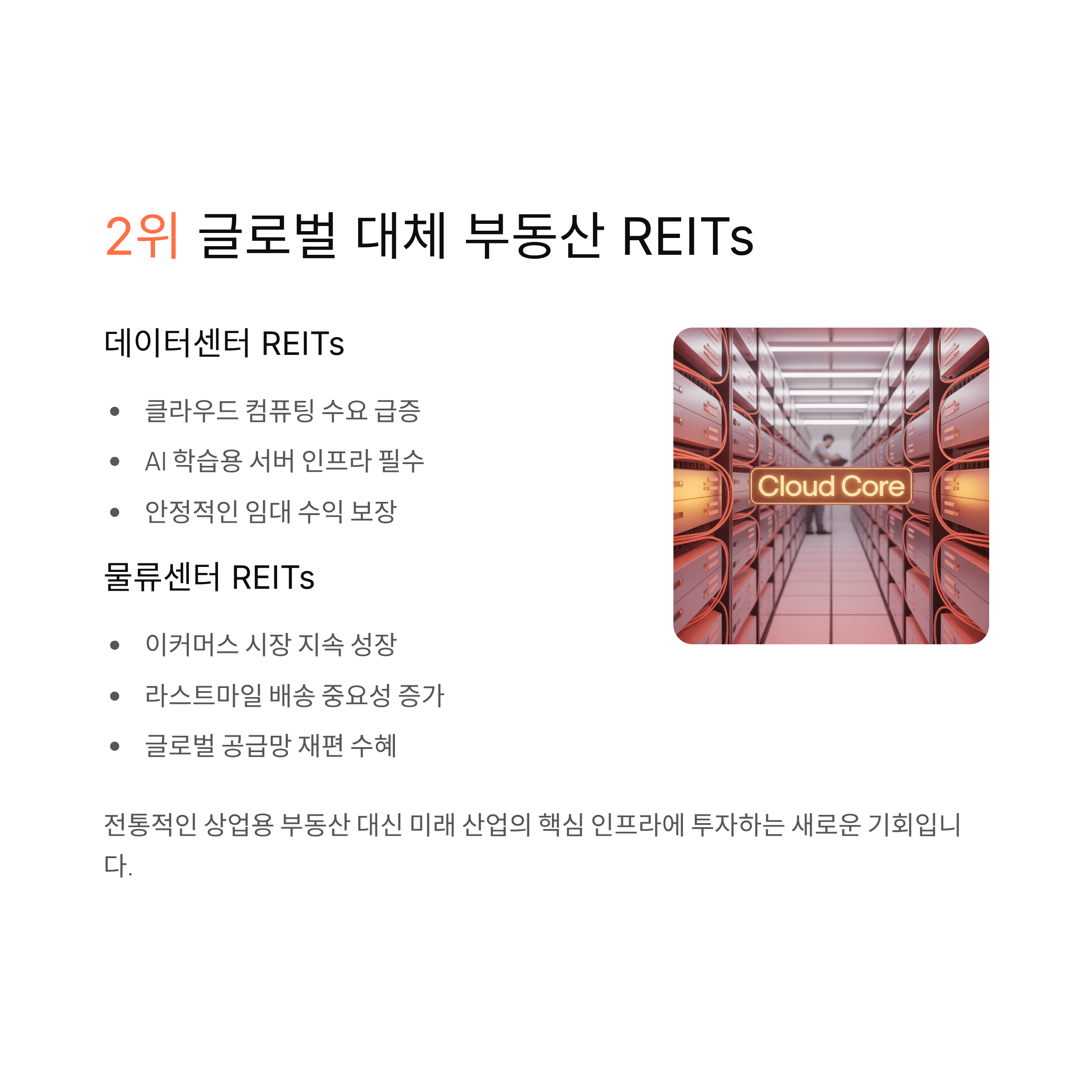 | 2 | 대체 부동산(REITs 등) | 디지털 전환 수혜, 고정 수익 자산 |