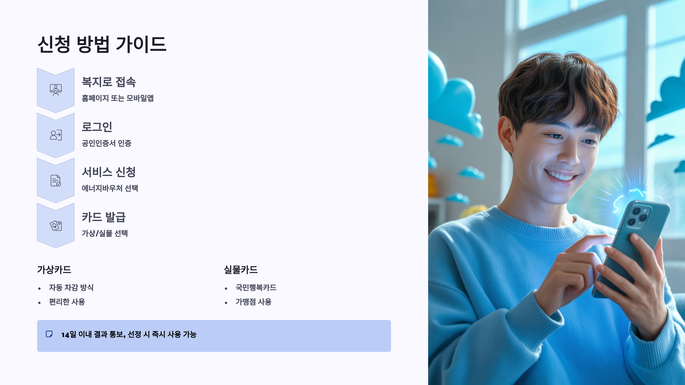 2025 난방비 지원 신청은 복지로 홈페이지나 모바일앱에서 간편하게 할 수 있습니다. 공인인증서로 로그인 후 '서비스 신청' 메뉴에서 에너지바우처를 선택하면 됩니다. 가상카드는 자동 차감되어 편리하고, 실물카드는 국민행복카드로 발급받아 가맹점에서 사용 가능합니다.